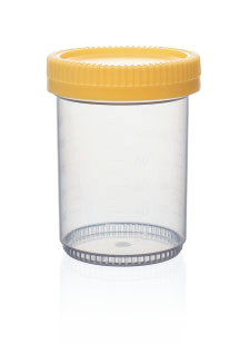 ML4020-5707-16Specimen container, leak-proof, stackable, PP material, Vol.150mL/Φ60-Φ50x80mm(H), molded graduation at each 10mL up to 120mL, white PE lid, unassembled, bulk pack, Non-sterile.3×100cups/bag+300lids/bag, 300pcs/carton